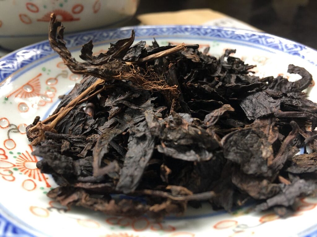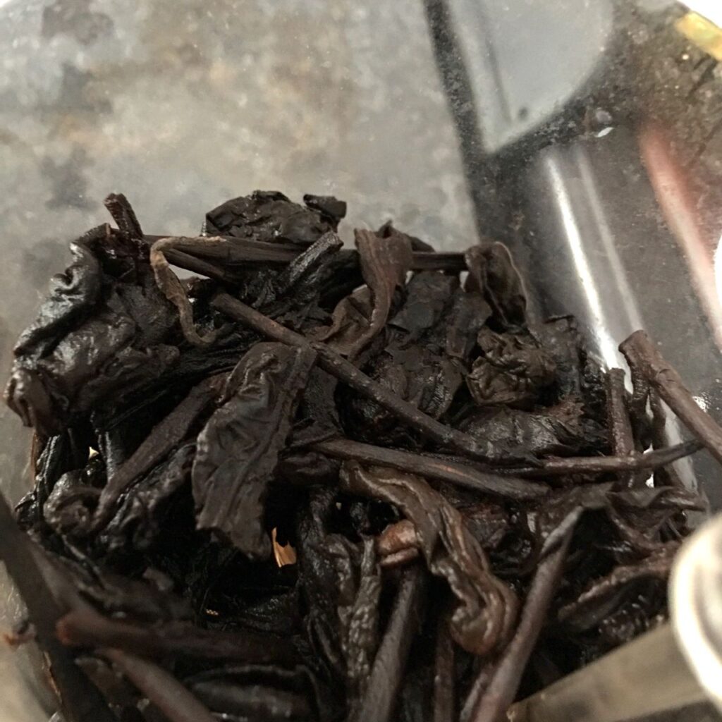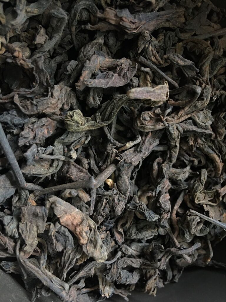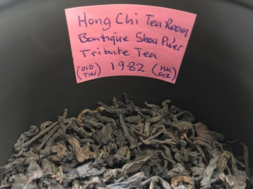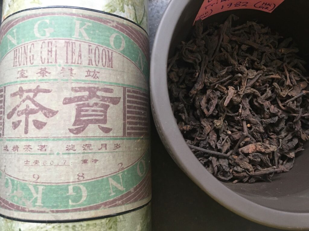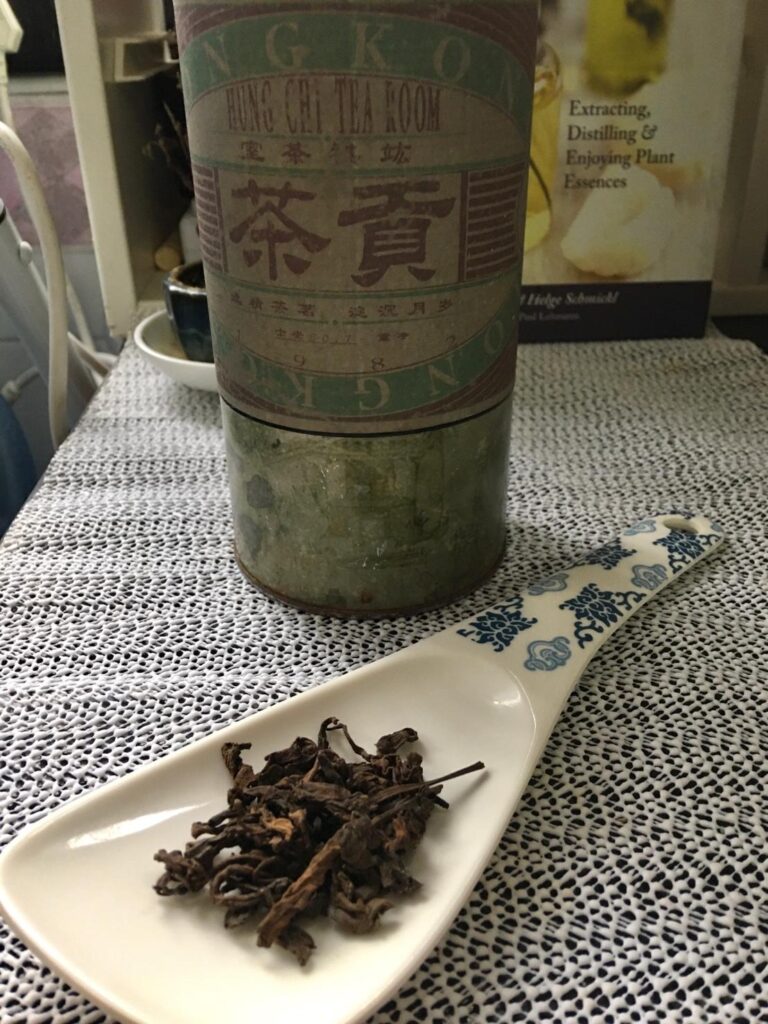 1982; var. assamica, and/or Qimao( taliensis); prepared in Menghai, Yunnan, packaged in Hong Kong, stored in Kunming, Yunnan; bud & 3-4 leaves, Menghai Wò Duī(握堆) Shou Pu’er process; elev. unknown; #TodaysTea, #今天的茶, #JīnTiāndeChá.