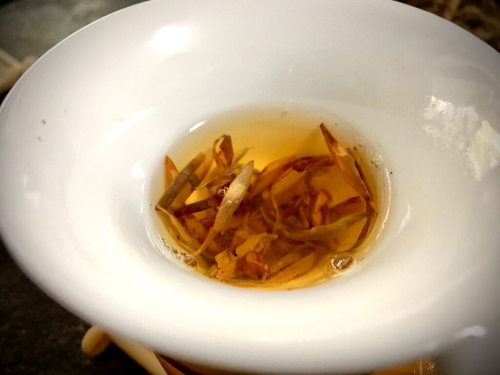 Opinion: Lei Kou Chai, or Lightning Struck Tea Tree tea. Apparently lightning struck the tree in the 70’s which changed the taste compared with other Dancongs. This tea has a mild, lingering taste and aroma which is pleasant.