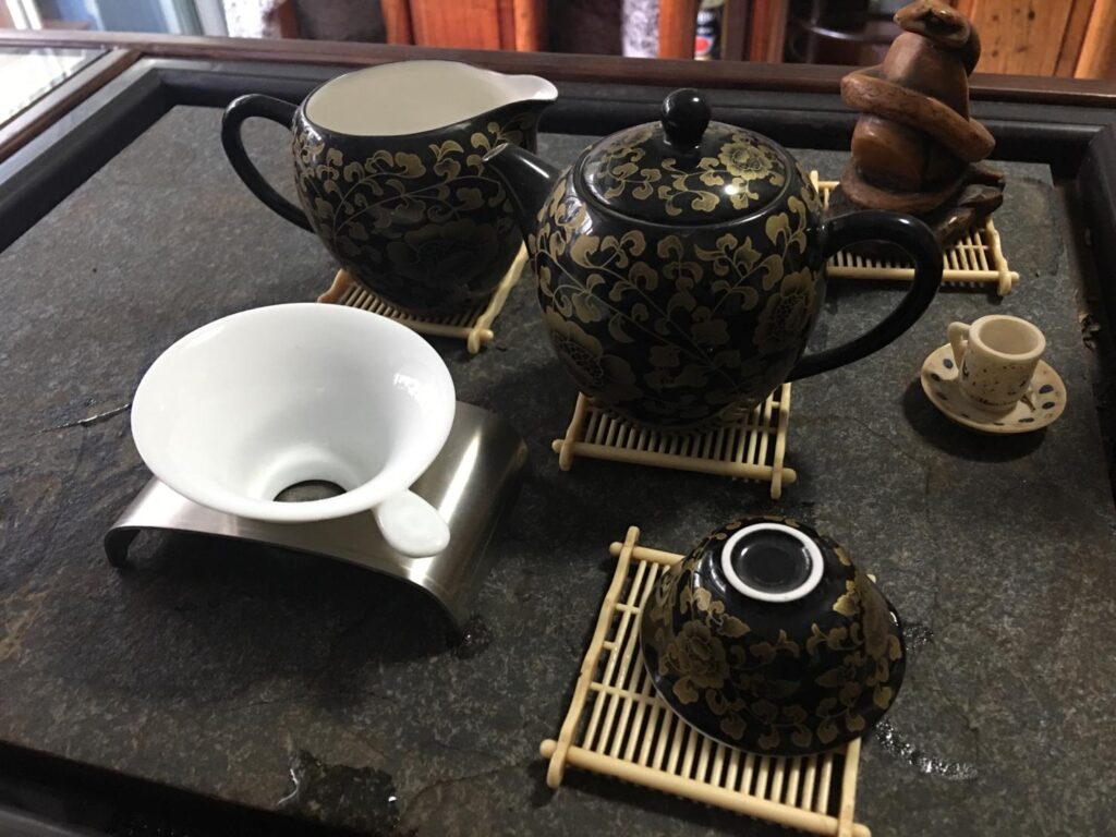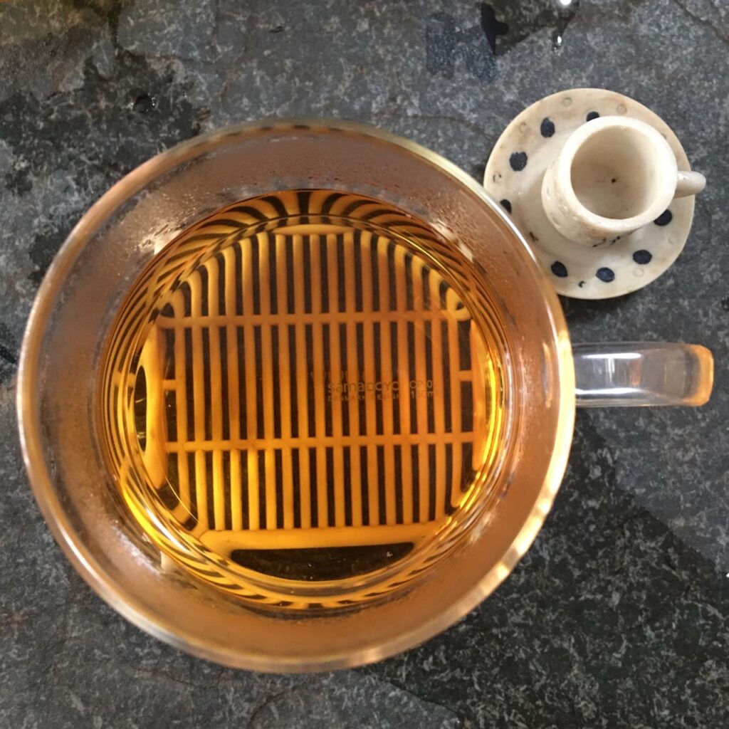 Opinion: Tea Sample. A vastly different taste in the cup compared with the previous two teas. The little metal device is a Spout strainer and also causes the tea to pour in a Vortex spiral.