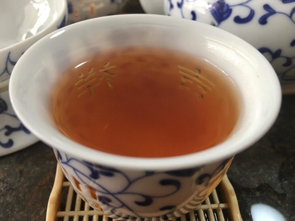 Dry leaf aroma: smokey, piney, cassia bark, dry ginger, hint of black cardamom; Wet leaf aroma: pine, camphor, wood fire, resinous, sharp, acrid; Liquor: red coluor with notable cinnamon character, and hints of ginger, and mace: a sweet and spicy aroma; Mouthfeel: thick, syrupy, tingling, soft, lingering spicyness, mouthwatering, late mild bitterness; Taste: sweet, smokey, bitter orange, with retronasal floral notes and long lingering sweet finish; when cool there are strong hints of tangerine;