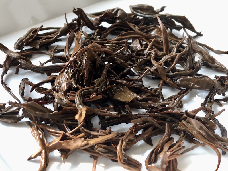 The dry leaf is almost black in color with red tinged edges with some occasional, lighter, greenish brown leaves interspersed.  The leaves are around 2-3 cm long, and lightly spiral rolled, or slightly twisted; While the dry leaf aroma, hints immediately of chocolate or cacao, followed by a fruity, floral spiciness.