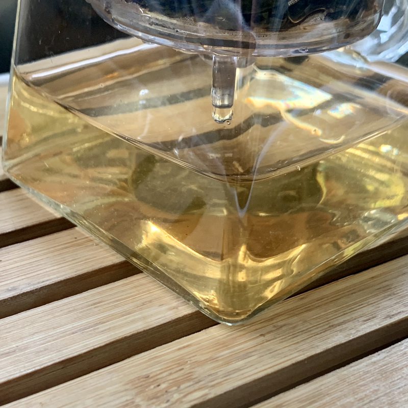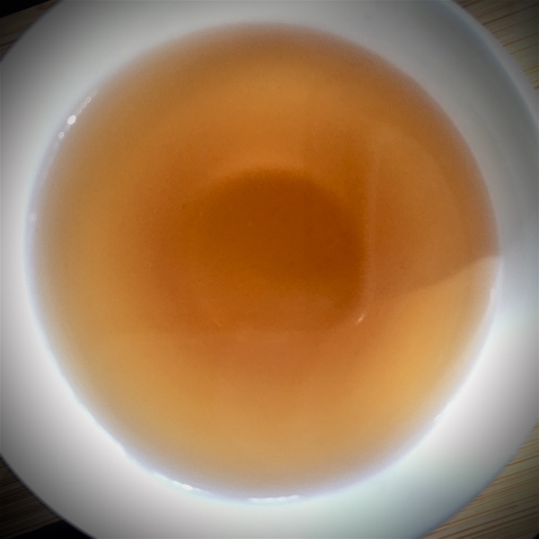 4g of dry leaf was infused in 120ml of water for 20-30sec. @95deg. C., producing an orange coloured brew tea liquor with a faint grainy aroma. The mouthfeel is viscous, thick, stimulating, mildly mineralish, with a sweet finish, whilst the taste demonstrates fragrant hints of apricot, with a retronasal peach aftertaste.