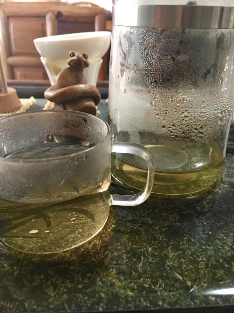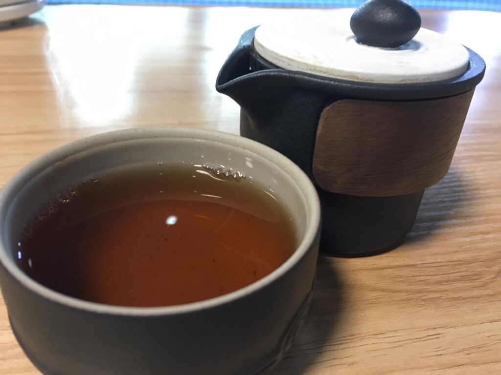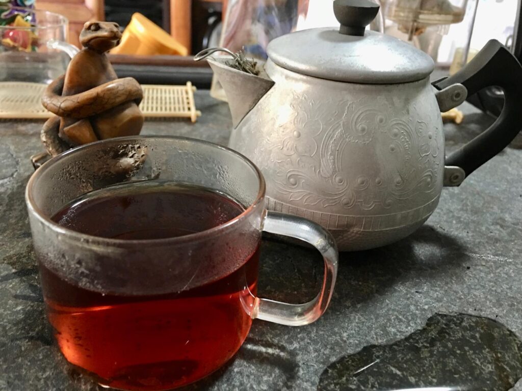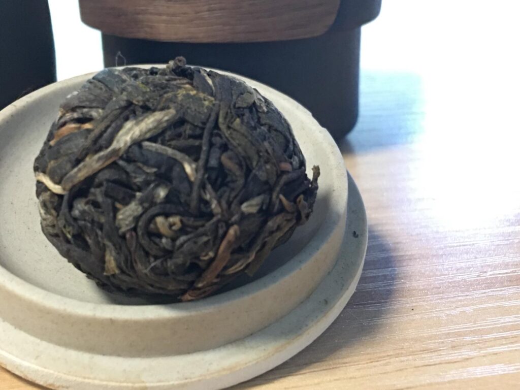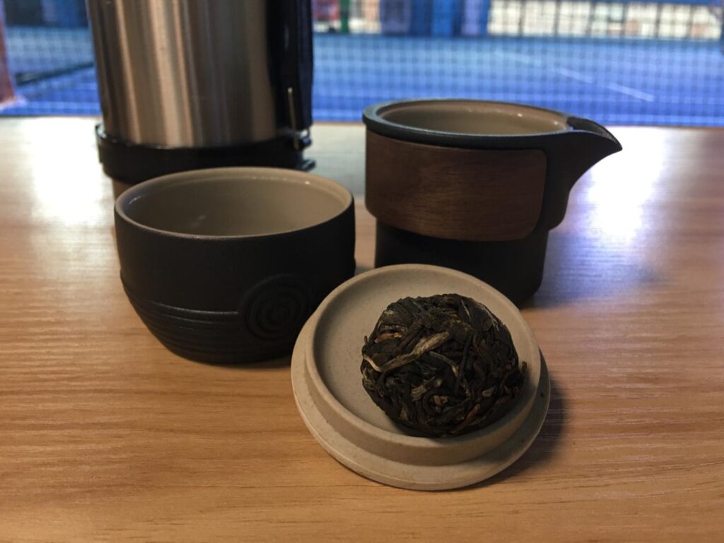 #TodaysTea: At my son’s tennis tournament – Dragon Ball Pu’er from Yunnan. Steamed aged cake, hand pressed by myself, into a ball in Shanghai in 2019.