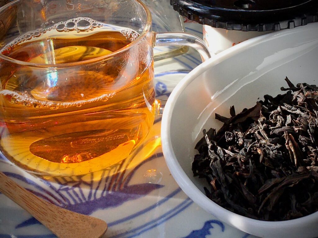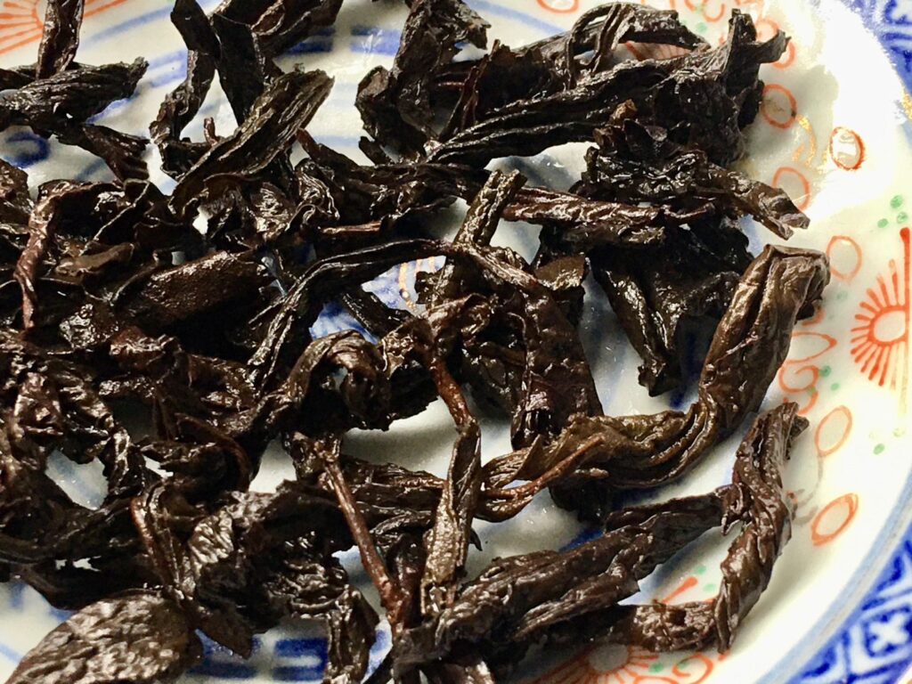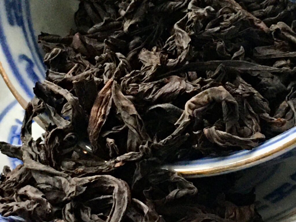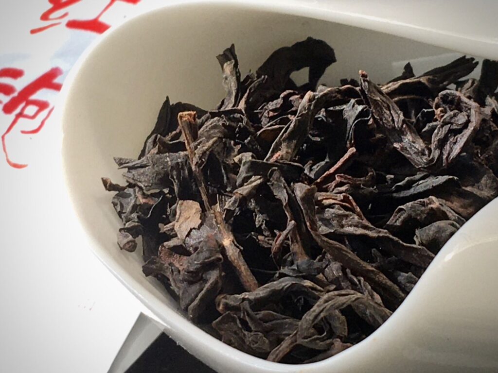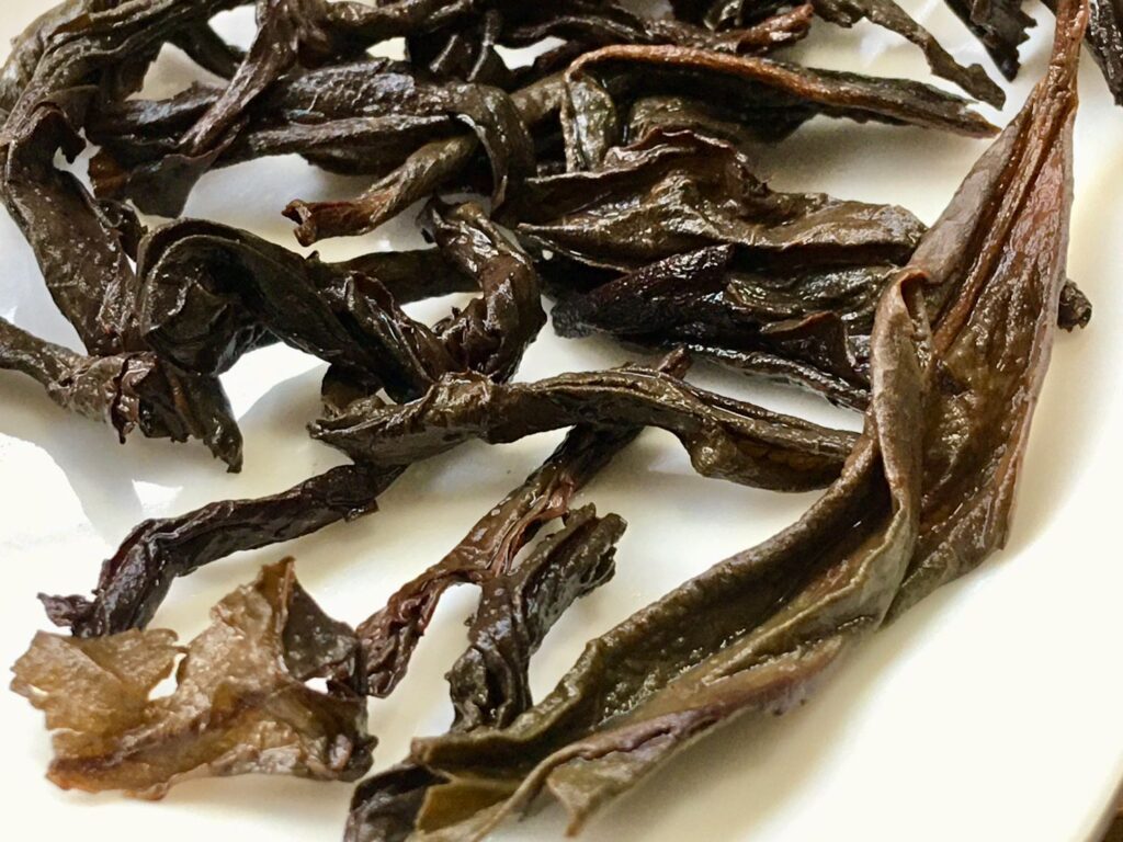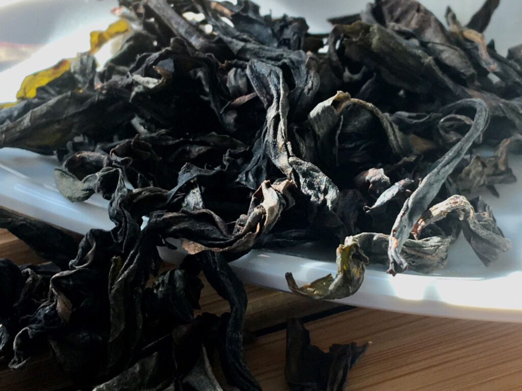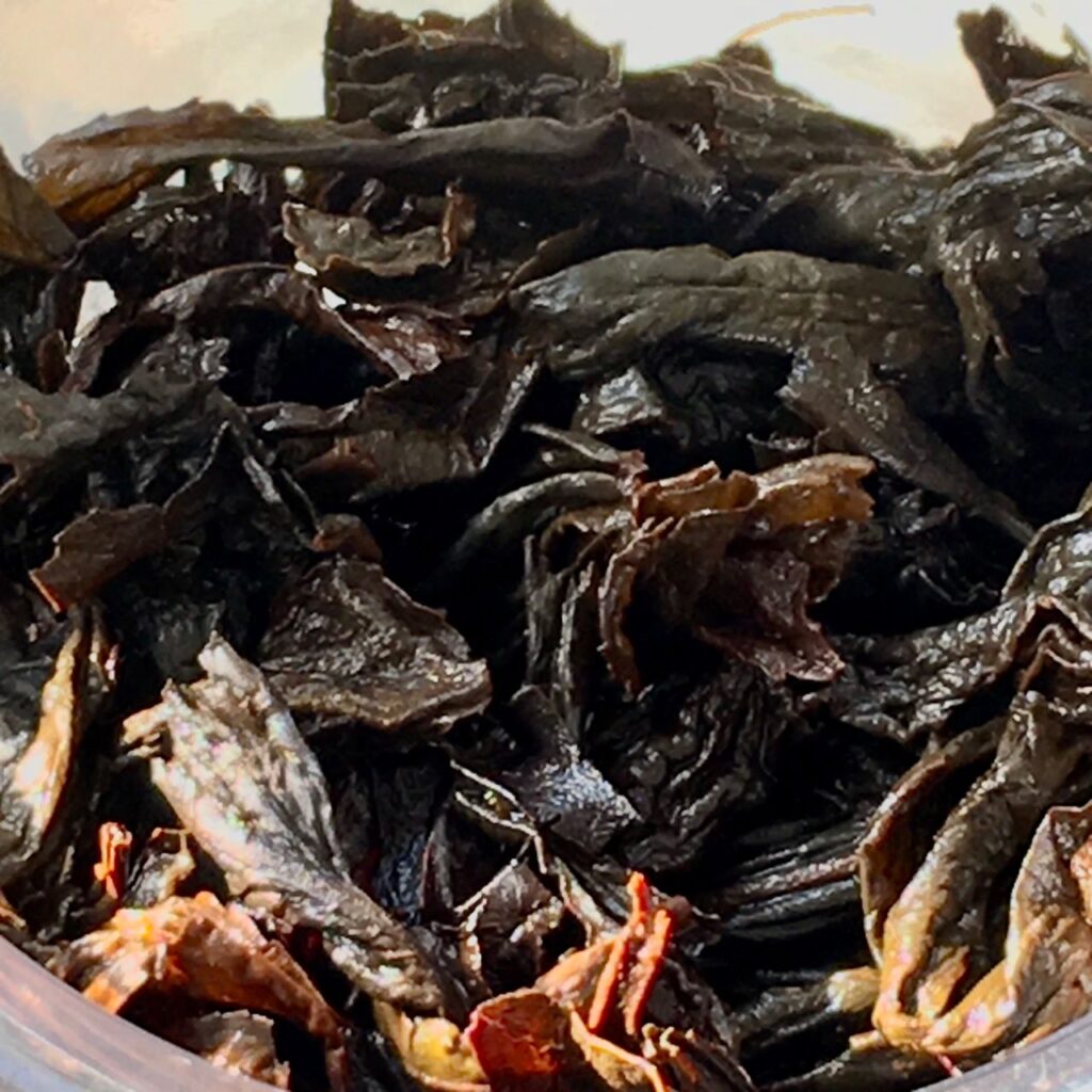 The dry leaves are dark brown and twisted, with a tobacco, and chocolate aroma. The wet leaves darken to a greenish black colour and exude a strong, smokey, spicy aroma with a hint of dark stone fruit and longan.