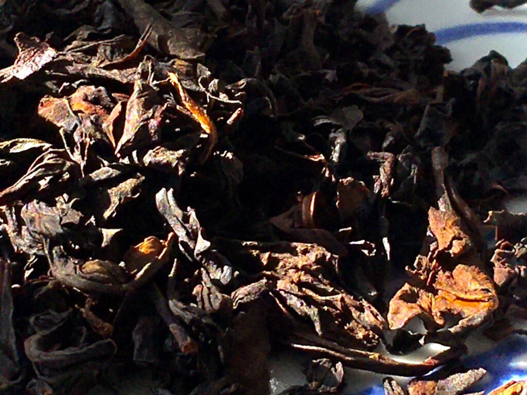 The dry leaf is elongated, twisted and very darkly oxidised with some reddish-brown (saffron) tints. The aroma is initially strong suggesting cold embers followed by hints of raisin, and chocolate. The wet leaves equally twisted and rigid and do not easily unfurl. Their aroma is woody, earthy, and suggestive of damp charcoal.