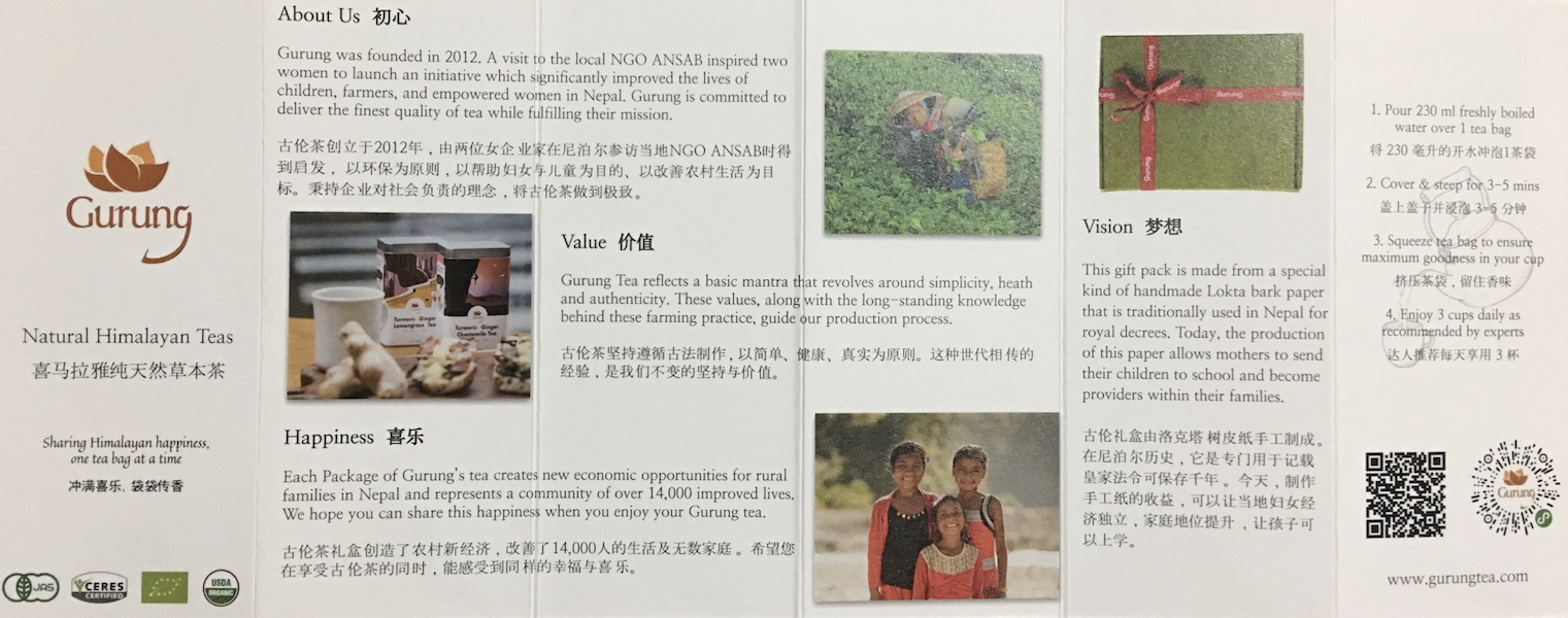 Today I met Manqing Lee, one of the two ladies who founded Gurung Natural Himalayan Teas Initiative, which supports poverty alleviation and empowerment in Nepalese Villages.