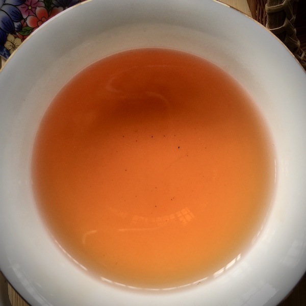 3.4g of dry leaves were infused in 120ml of water for 20sec.@90-100deg.C., producing a bright orange coloured tea liquor with an aroma similar to the wet leaves.